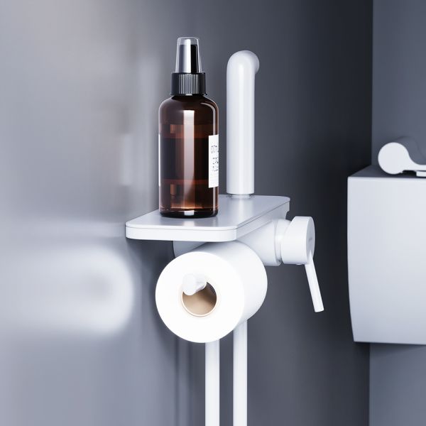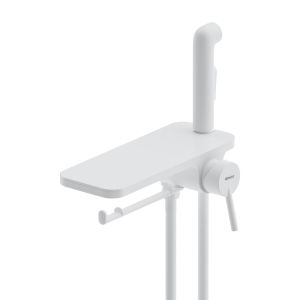 Гигиенический душ Damixa Jupiter со смесителем и полкой, белый 773500200Современное решение для вашего удобства и гигиены теперь в новом исполнении: смеситель с гигиеническим душем отличается простотой и комфортом в использовании, а еще он выглядит невероятно стильно в новом белом цвете. Самое практичное гигиеническое решение: смеситель оснащен удобной полочкой, на которой поместится все, что необходимо под рукой, и держателем для туалетной бумаги. Смеситель с гигиеническим душем имеет компактный размер и монтируется непосредственно в стену, что помогает установить его даже в небольших санузлах. Смеситель оборудован ручкой-стиком, которая удобно ложится в руку и гарантирует комфортное использование гигиенического душа. Керамический картридж Light Flow обеспечивает плавное управление ручкой смесителя и оптимальную регулировку температуры и мощности потока.