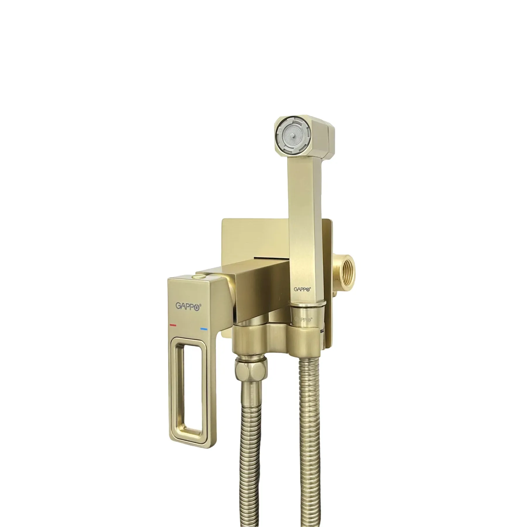 Смеситель для биде из латуни с гигиенической лейкой GAPPO (ГАППО) Встраиваемый смеситель с гигиеническим душем даёт возможность без проблем регулировать напор воды при помощи однорычажного управления. Основной материал в гигиеническом смесителе - латунь, это надежный красивый материал высочайшего качества. Смеситель с гигиеническим душем скрытого монтажа изготовлен для монтажа в стену. Удобство модели заключается в том, что все подводные коммуникации скрыты за стеной, а то, что осталось "на виду" - это главные элементы, которые внешне привлекательны.