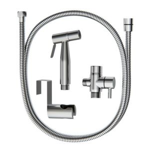 Гигиенический набор в цвете хром: гигиенический душ d25 мм (1 режим) на гибком шланге 120 см с защитой от перекручивания. В комплекте настенный держатель и держатель на край бочка.