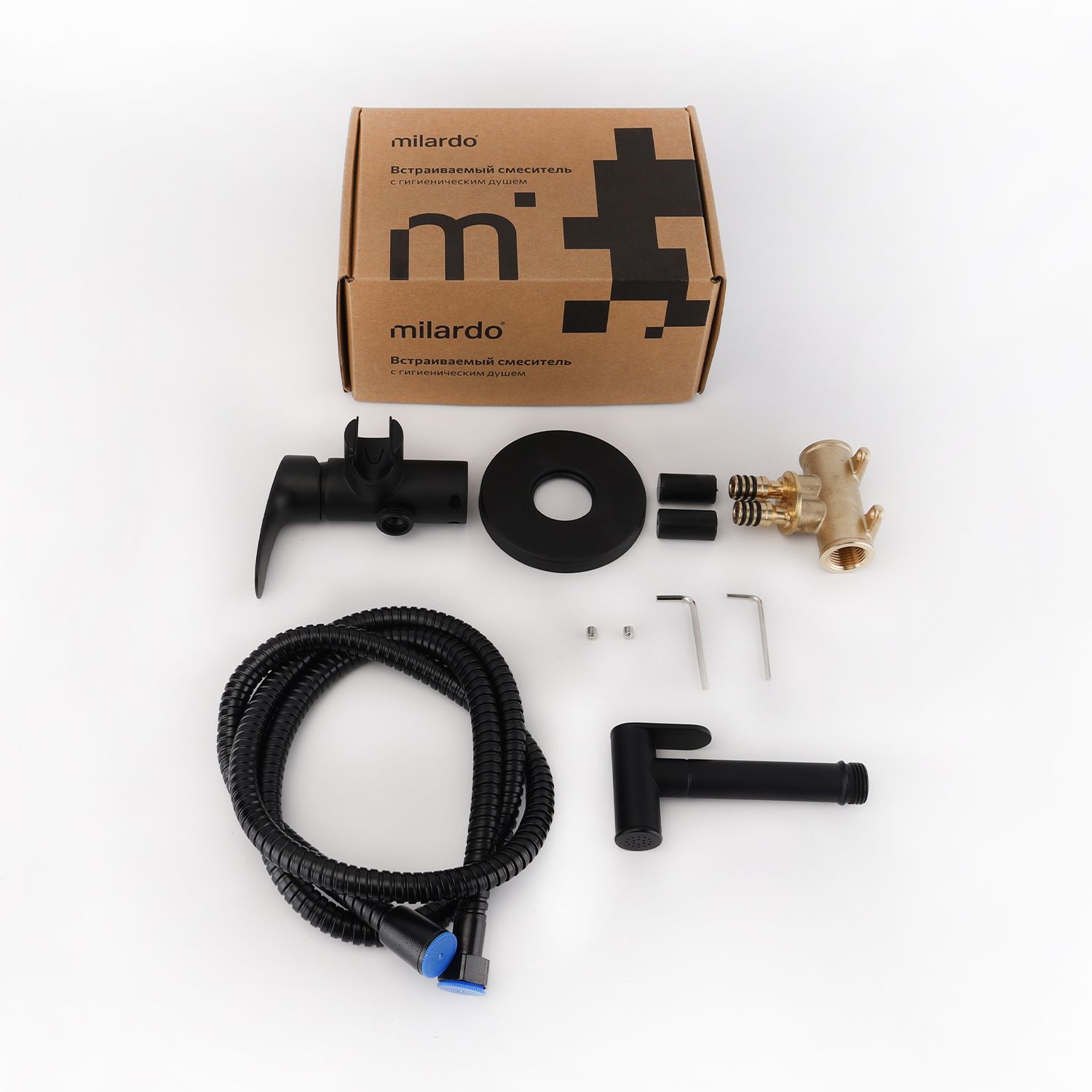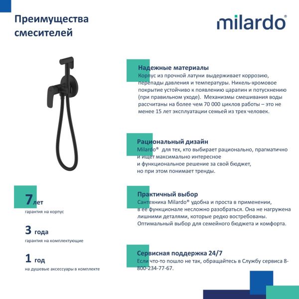 Смеситель с гигиеническим душем Rora отличается универсальным характером: основной акцент в его дизайне приходится на плавные линии корпуса и трендовый черный цвет. Держатель для лейки интегрирован в компактный корпус смесителя – удобно для санузлов небольшой площади. Простое рычажное управление позволяет управлять смесителем в одно движение. • Гигиеническая лейка из ABS-пластика и душевой шланг из ПВХ (1,5 м) идут в комплекте. • Качественный механизм смешивания воды смесителя Milardo® рассчитан на более чем 70 000 циклов работы – это не менее 15 лет эксплуатации семьей из трех человек. • Электрофоретическое матовое покрытие делает поверхность смесителя устойчивой к условиям высокой влажности – такой смеситель прослужит дольше и сохранит свой первоначальный внешний вид. • Гарантия на смесители Milardo® – 7 лет, на картридж – 3 года, на душевые аксессуары – 1 год. (с) Авторский текст, сентябрь 2022 г.
