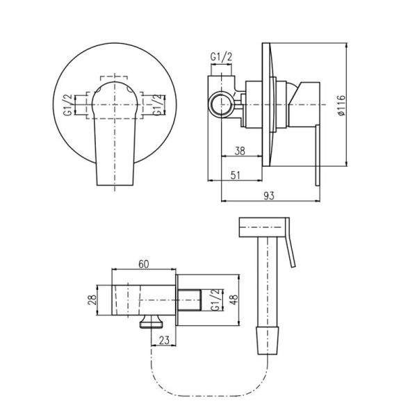 Комплектация: смеситель, лейка, шланговое подключение с держателем лейки, шланг, внутренняя часть