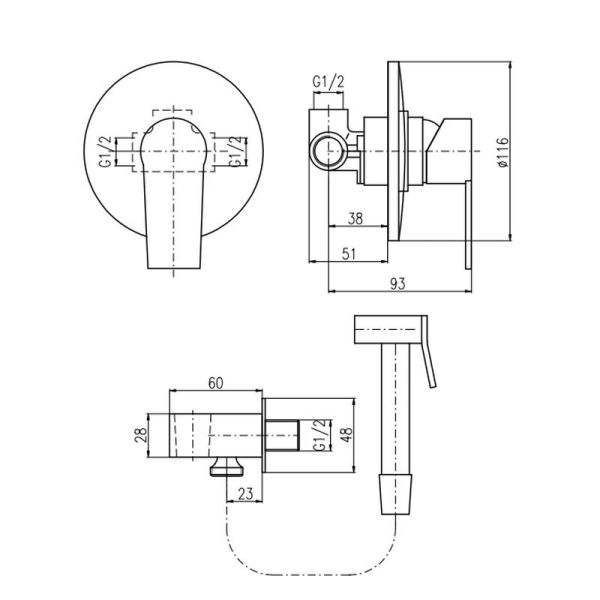 Комплектация: смеситель, лейка, шланговое подключение с держателем лейки, шланг, внутренняя часть