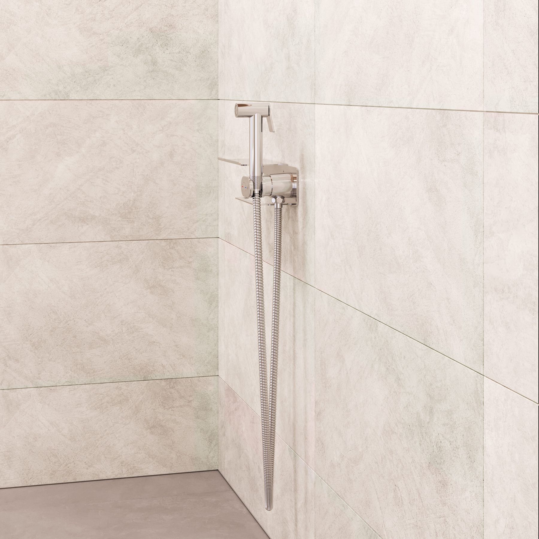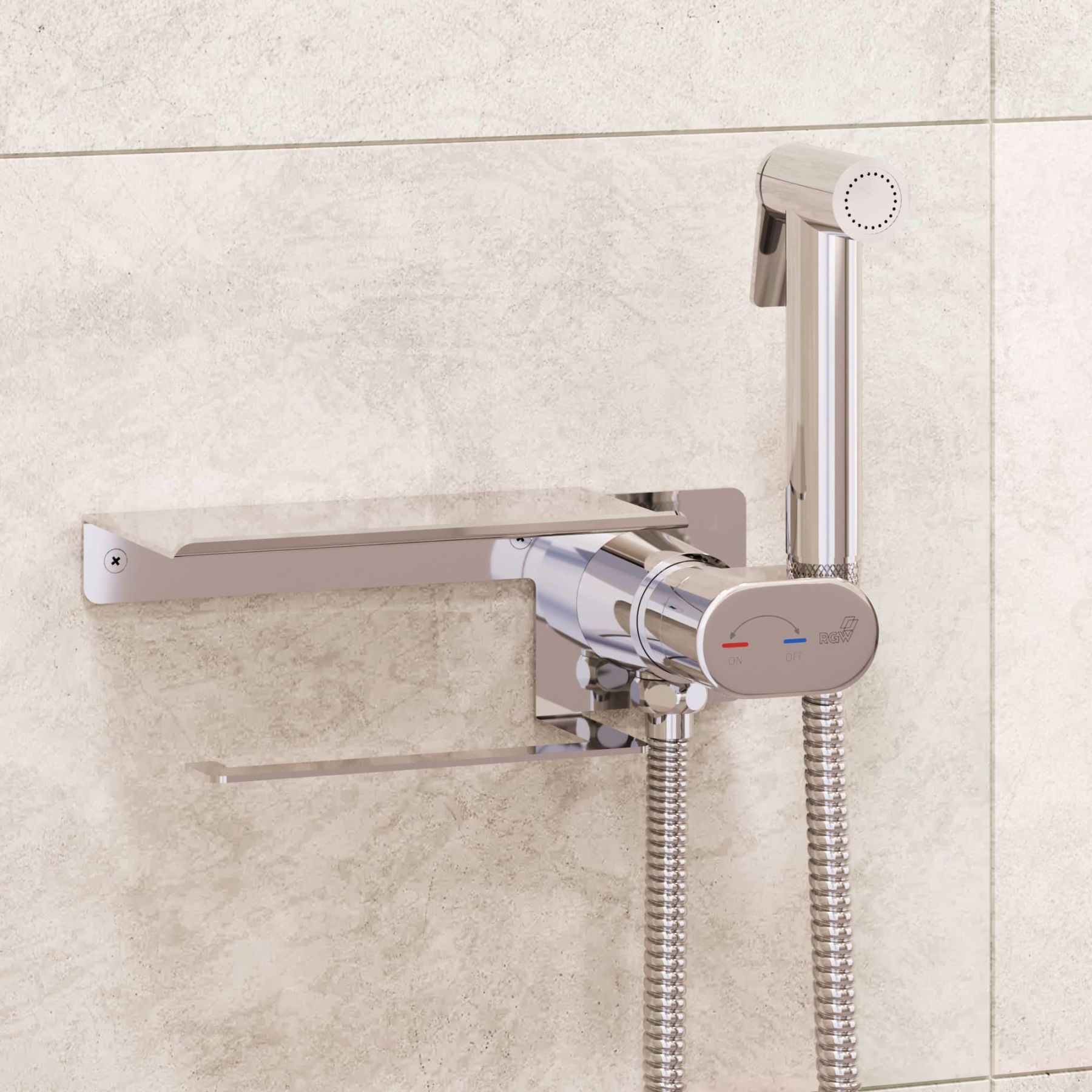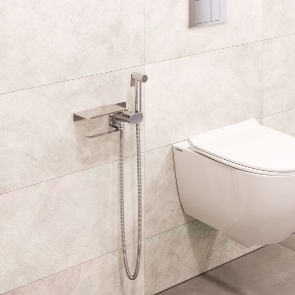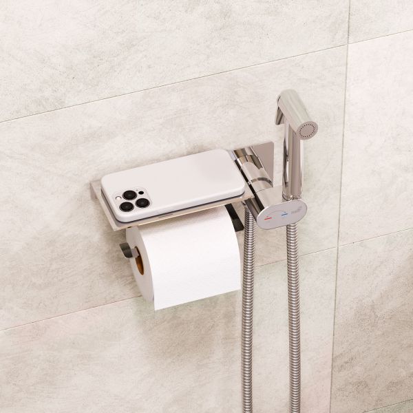 Смеситель на одно монтажное отверстие, инсталляция (встраиваемый) в стену. Керамический прогрессивный картридж. Корпус смесителя полностью литой выполнен из высокопрочной сантехнической латуни.Смеситель однорычажный с двумя потоками подводки воды: горячей и холодной. Он разработан для компактного размещения рядом с унитазом или в наиболее удобном месте в зоне сан узла. Скрытый монтаж (инсталляционный) предполагает часть корпуса смесителя утапливать (встраивать) в стену, что обеспечивает минимализм в дизайне.Отдельно накладкой на смеситель в комплекте имеется полка и кронштейн, он же держатель туалетной бумаги или полотенца. Полочка и держатель выполнены из нержавеющей стали толщиной 3 мм. Дополнительно на полочке присутствует небольшой бортик, который предотвращает соскальзывание предметов и удерживает мелкие и небольшие предметы внутри полки, предотвращая их потерю. Во время и после использования душа не нужно идти за средствами гигиены и туалетной бумагой, благодаря смесителю с держателем и полочкой все необходимое находится под рукой. Такая конструкция экономит место, так как не нужно устанавливать отдельно держатель и полочку, занимая дополнительное место на стене. Гигиенический душ с держателем для туалетной бумаги и полочкой из нержавеющей стали повышает уровень комфорта.Смеситель и гигиеническая лейка имеет круглую форму. Струя из гигиенического душа выходит плотная, упругая и направленная. Напор струи регулируется с помощью клавиши (кнопки) на лейке: от мягкого рассеянного потока до интенсивного. Температура воды легко регулируется от прохладной до комфортно тёплой. Вода подаётся равномерно без пульсаций, обеспечивая точное и аккуратное очищение. Форма струи в этой модели узконаправленная, что обеспечивает максимальное удобство в процессе гигиенической процедуры.Гибкий шланг «RGW --- Стильные душевые» имеет длину 120 см и выполнен из материалов премиального качества, так как верхний слой состоит из металлической оплетки, которая защищает от внешних механических повреждений, а внутренний слой --- это шланг из гибкого термостойкого полимерного силикона. Внутренний шланг устойчив к резким перепадам давления и гидравлическим ударам, со временем не образуются изломы, а также особый состав полимерного силикона исключает появление грибка и плесени.