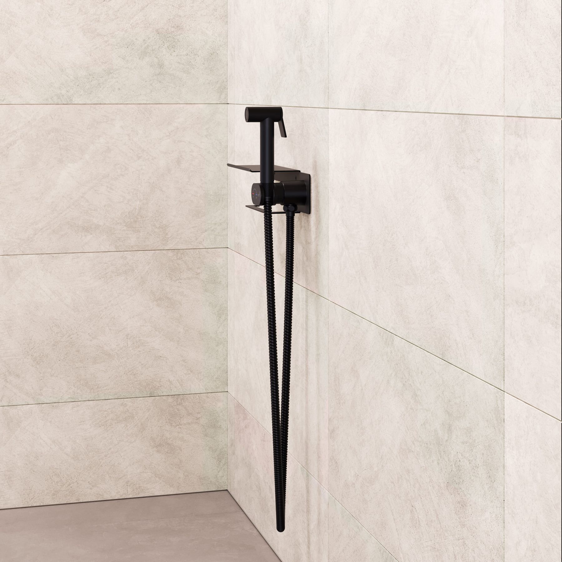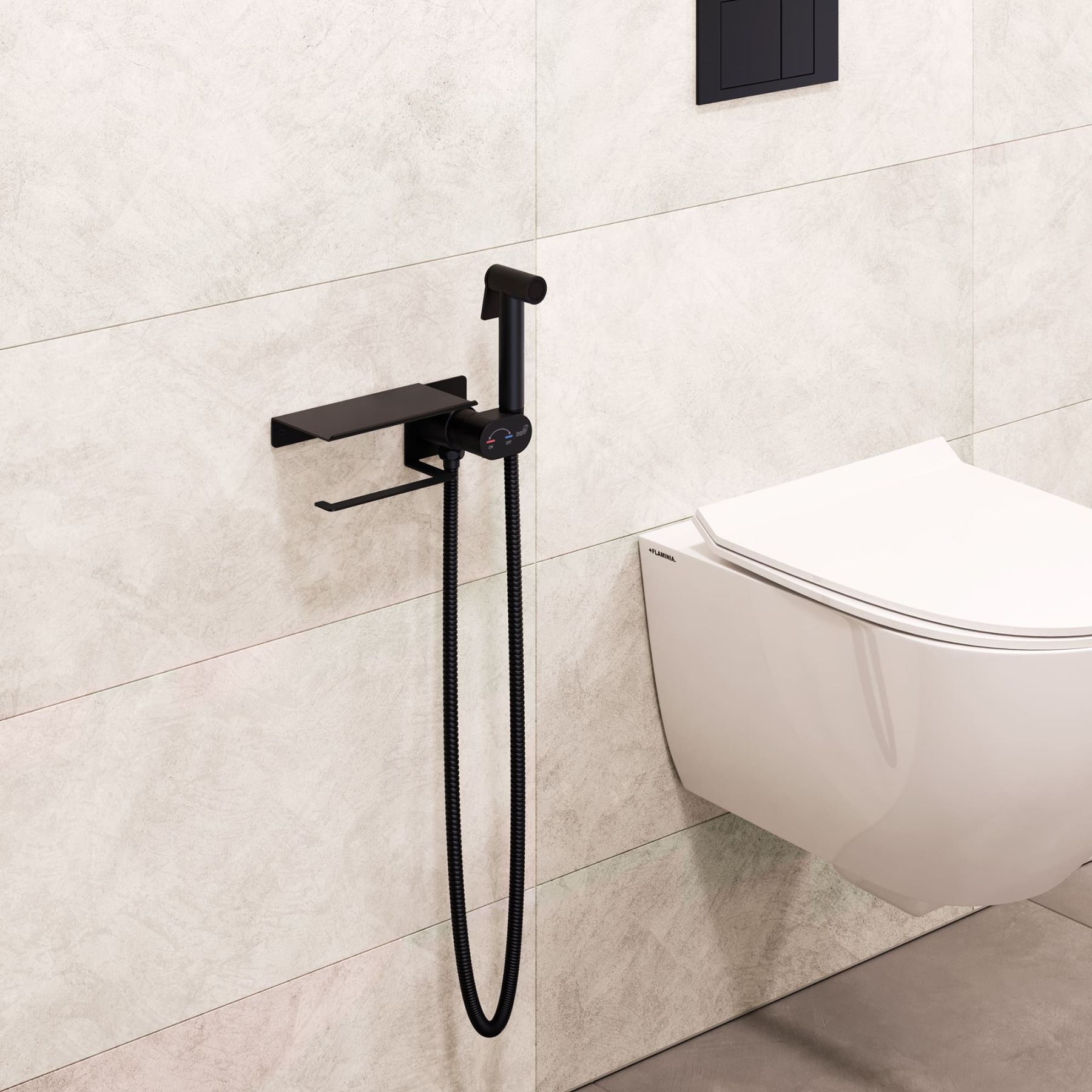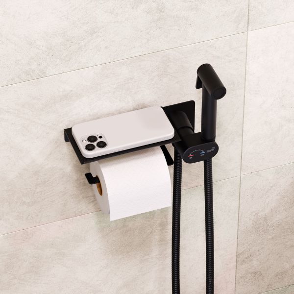 Гигиенический смеситель с прогрессивным картриджем, встраиваемый в стену, с накладной полкой и держателем туалетной бумаги или полотенца, гигиеническая лейка в комплекте - RGW SP-221B, черныйКомплект Гигиенического душа с прогрессивным картриджем, встроенный в стену, черного цвета RGW SP-221B с прогрессивным смесителем для плавного управления температурой (от холодной до горячей) и краном (затвором подачи воды) с держателем лейки --- система «Умная блокировка».Гигиенический душ для туалета RGW SP-221B комплектуется стальной полочкой для мыла и гигиенических принадлежностей, держателем для туалетной бумаги/полотенца. Лейка гигиенического душа и смеситель имеют круглую форму, а конструкция смесителя предполагает инсталляционный вид скрытого монтажа, встраиваемый в стену. Важно, что корпус смесителя выполнен из высокопрочной сантехнической латуни.Смеситель гигиенического душа с системой «Умная блокировка» и поворотным управлением --- это новаторское сантехническое оборудование в сегменте «Смесители и лейки». В основе идеи: рычаг, которым обычно производят регулировку температуры имеет вид кронштейна и является держателем лейки с блокировкой примеса воды и небольшая душевая лейка с дополненной клавишей для подачи воды.Основная функция гигдуша для современного человека — соблюдение личной гигиены в повседневной жизни без использования туалетной бумаги. Ушел в прошлое смеситель под биде, теперь вы можете купить биде без отверстий под смеситель и добавить к нему на стену гигиенический душ со шлангом. Однако в последние годы биде утрачивает свою актуальность, и установка биде в ванной комнате зачастую нецелесообразна, так как комбинация унитаз плюс гигиенический душ успешно справляется с функционалом за счет широты сливной трубы в унитазе и заменяет устаревшую систему. Гигиенический душ для туалета и биде имеет широкий спектр возможностей и ряд бытовых преимуществ, например: