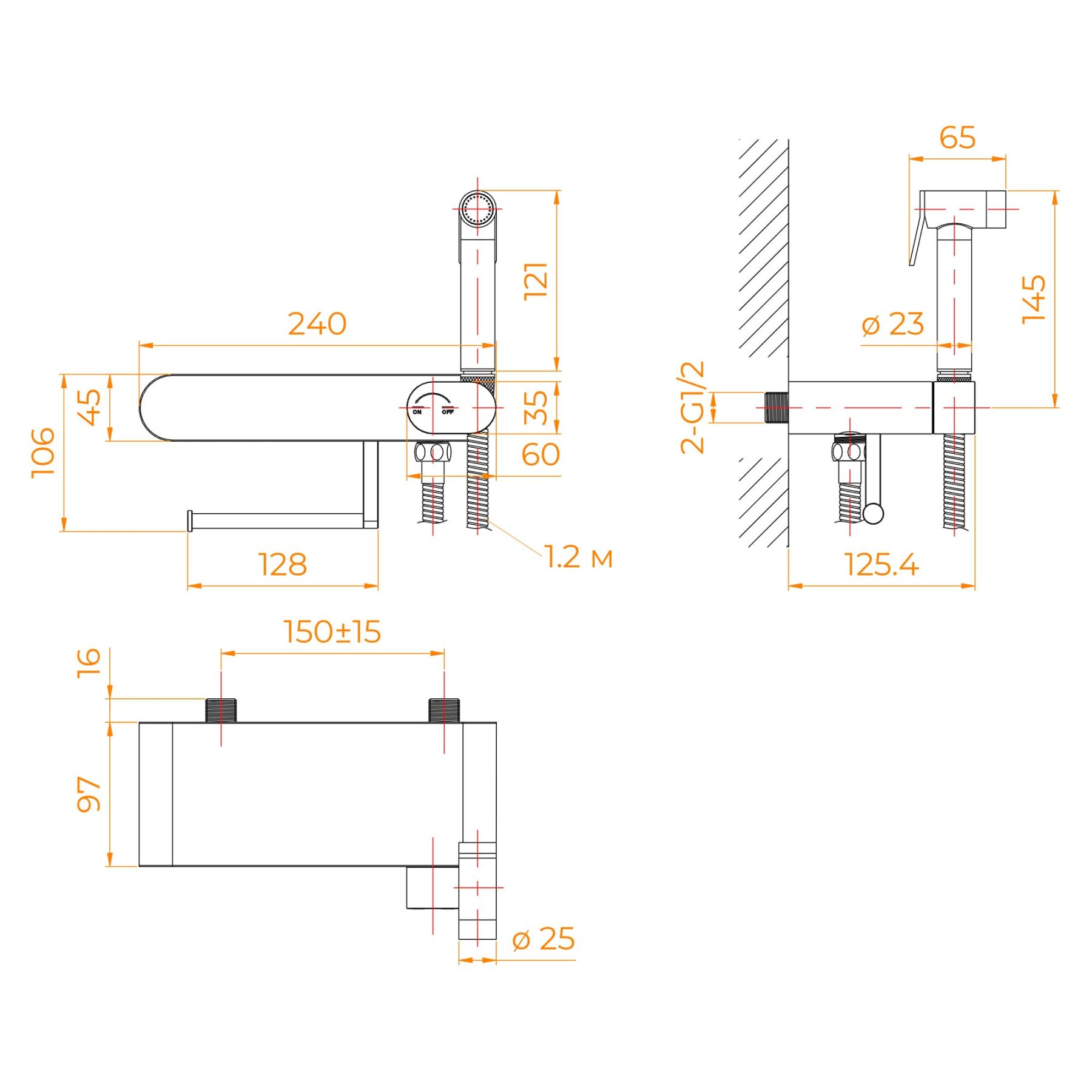 Установка гигиенического душа со смесителем — навесная на внешнюю часть стены. Сантехническое оборудование требует заранее запроектированного месторасположения. Требование к установке: месторасположение должно быть запланировано заранее, чтобы сделать подводку труб на этапе черновой отделки помещения. Рекомендованная высота установки 50 см от пола. В данном изделии смеситель имеет два монтажных входа с установкой на эксцентриках. Желательно при расчете установочного места правильно запроектировать его размещение согласно желаниям будущих пользователей, учитывая их особенности жизни и удобство пользования.Рабочее давление воды: 3-4 бар.Максимальное давление воды: 5 бар.При установке смесителя с гигиеническим душем рекомендуем воспользоваться услугами нашей монтажной группы RGW для гарантии долговечного использования.