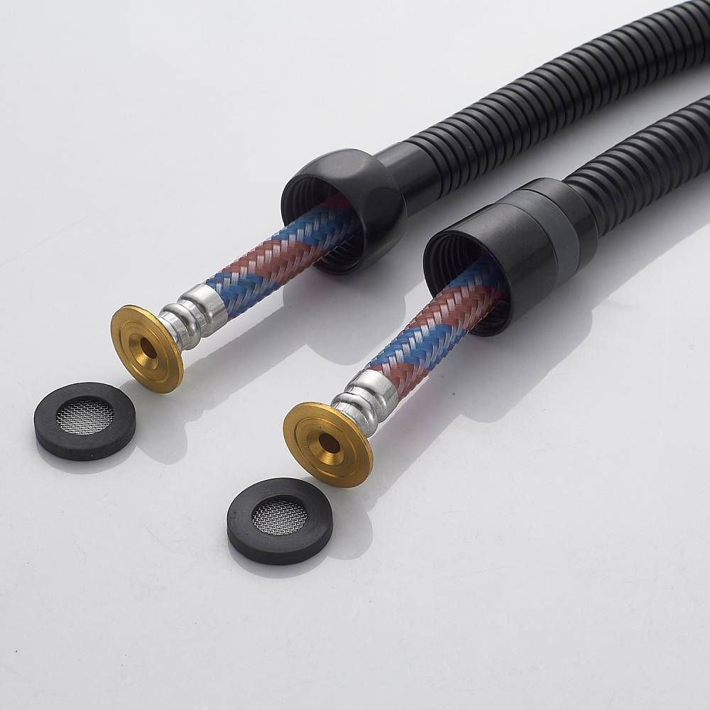 Лейка гигиенического душа выполнена из ABS пластика, её держатель удобно расположен на корпусе смесителя, что способствует удобному использованию. В комплект входит шланг в двойной металлической оплетке длиной 120 см, который отличается надежностью и защищает от повреждений.