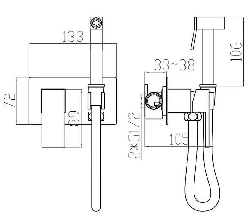 S97.52.06 Встраиваемый гигиенический душ, выполнен из латуни в черном цвете, шланг 120 см и лейка в комплекте.