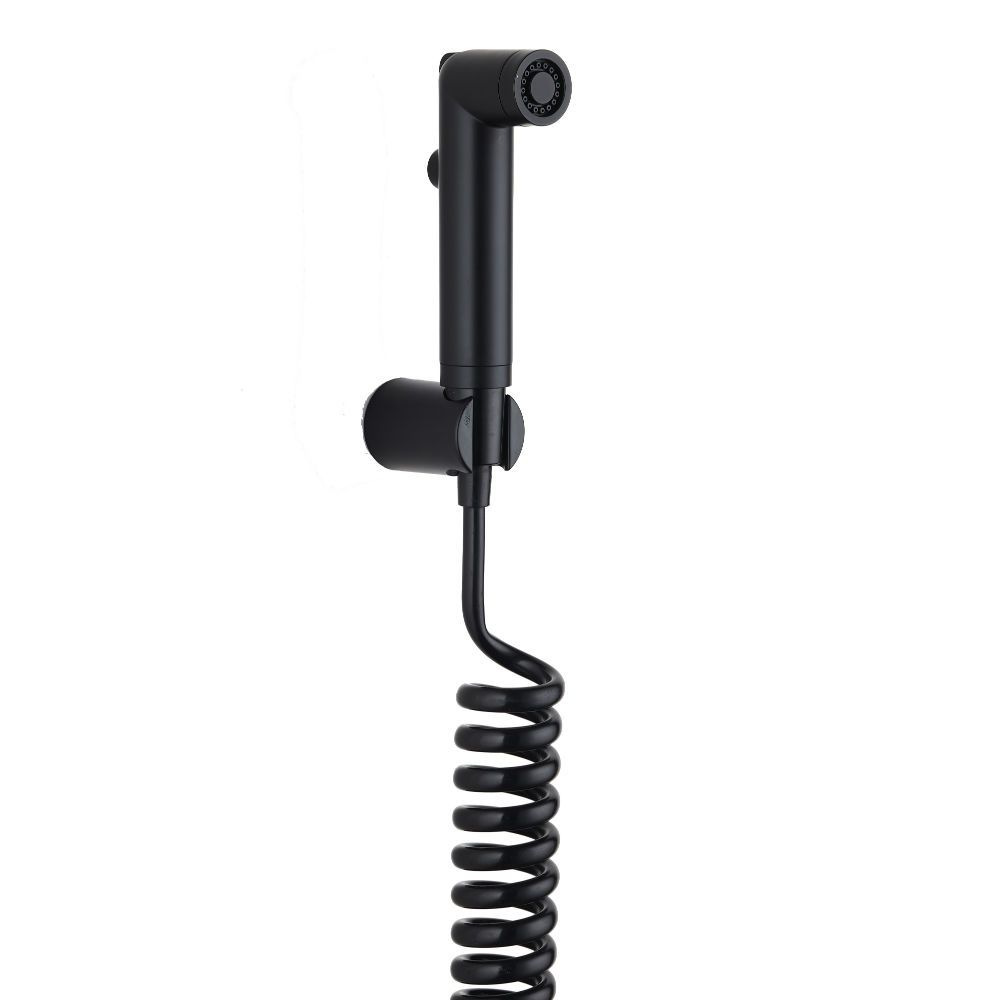 Гигиенический набор в цвете матовый черный: гиг душ d25 мм (1 режим) на гибком шланге 120 см с защитой от перекручивания. В комплекте настенный держатель.