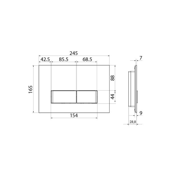 Универсальная клавиша смыва. Материал: стекло. Цвет: черный. Хромированные кнопки Крепежная рама в комплекте. Упаковка: картонная коробка.