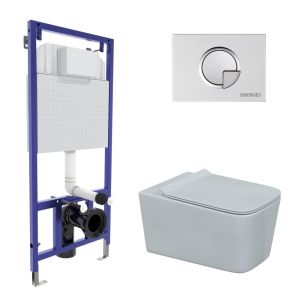 Полный комплект BERGES для монтажа подвесного унитаза. 1. Инсталляция NOVUM525Толщина бачка 80 мм.Межосевое расстояние под крепежные шпильки унитаза 18 и 23 см.Резервуар воды объемом 10 литров с тепло-шумоизоляцией.Уровень шума при давлении 3 бар не превышает 13 дБ.Подвод воды сверху (G1/2 наружная).Объем смыва 3/6 литра с возможностью регулировки. Металлический каркас, окрашенный антикоррозийной эмалью, расчетная нагрузка до 400 кг.Ножки регулировки высоты из оцинкованной стали. Возможность установки в угол. 2. кнопка R2 матовый хромABS-пластик 3. унитаз FLOE Rimless,безободковая система смыва, антибактериальное покрытиеэкономия воды, скрытый крепеж 4. сиденье дюропласт Floe Slim SOмикролифт, быстросъем. Все крепежи для установки в комплекте