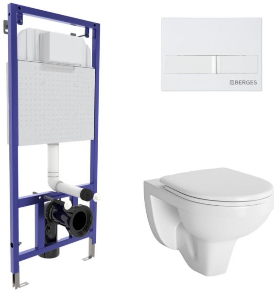 Полный комплект BERGES для монтажа подвесного унитаза. 1. Инсталляция NOVUM525Толщина бачка 80 мм.Межосевое расстояние под крепежные шпильки унитаза 18 и 23 см.Резервуар воды объемом 10 литров с тепло-шумоизоляцией.Уровень шума при давлении 3 бар не превышает 13 дБ.Подвод воды сверху (G1/2 наружная).Объем смыва 3/6 литра с возможностью регулировки. Металлический каркас, окрашенный антикоррозийной эмалью, расчетная нагрузка до 400 кг.Ножки регулировки высоты из оцинкованной стали. Возможность установки в угол. 2. кнопка L1белая 3. унитаз GAMMAкаскадный смыв, открытый ободокантибактериальное покрытиеэкономия воды 4. сиденье дюропласт Gammaмикролифт, быстросъем Все крепежи для установки в комплекте