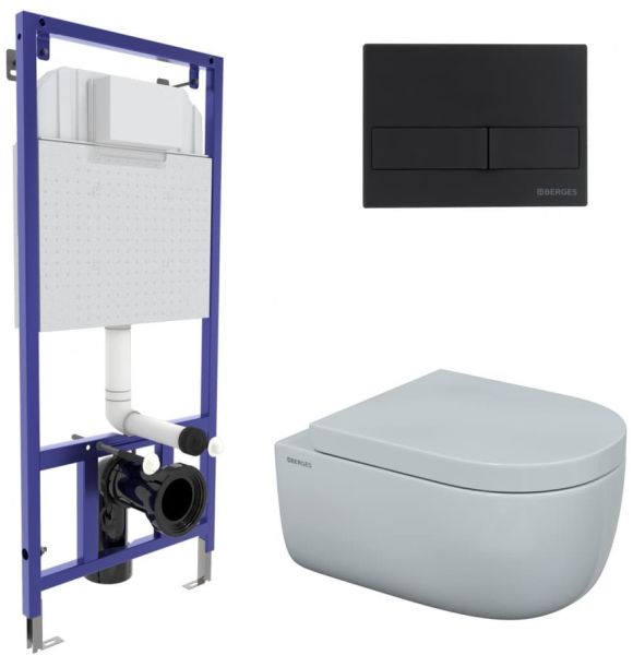 Полный комплект BERGES для монтажа подвесного унитаза. 1. Инсталляция NOVUM525Толщина бачка 80 мм.Межосевое расстояние под крепежные шпильки унитаза 18 и 23 см.Резервуар воды объемом 10 литров с тепло-шумоизоляцией.Уровень шума при давлении 3 бар не превышает 13 дБ.Подвод воды сверху (G1/2 наружная).Объем смыва 3/6 литра с возможностью регулировки. Металлический каркас, окрашенный антикоррозийной эмалью, расчетная нагрузка до 400 кг.Ножки регулировки высоты из оцинкованной стали. Возможность установки в угол. 2. кнопка L5Soft Touch чернаяABS-пластик 3. унитаз EGO XL Rimless,безободковая система смыва, антибактериальное покрытиеэкономия воды, скрытый крепеж 4. сиденье дюропласт Toma SOмикролифт, быстросъем. Все крепежи для установки в комплекте