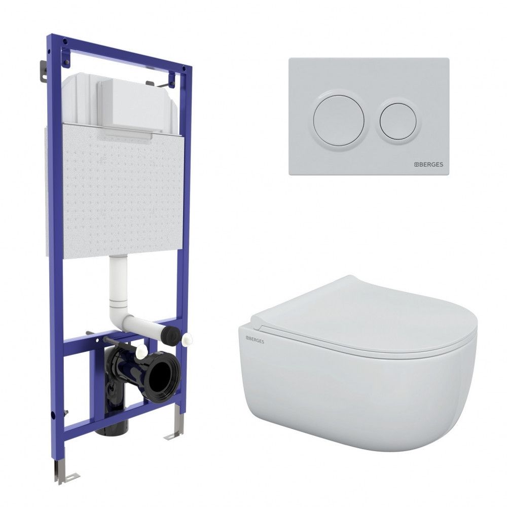Полный комплект BERGES для монтажа подвесного унитаза. 1. Инсталляция NOVUM525Толщина бачка 80 мм.Межосевое расстояние под крепежные шпильки унитаза 18 и 23 см.Резервуар воды объемом 10 литров с тепло-шумоизоляцией.Уровень шума при давлении 3 бар не превышает 13 дБ.Подвод воды сверху (G1/2 наружная).Объем смыва 3/6 литра с возможностью регулировки. Металлический каркас, окрашенный антикоррозийной эмалью, расчетная нагрузка до 400 кг.Ножки регулировки высоты из оцинкованной стали. Возможность установки в угол. 2. кнопка O1 белая 3. унитаз EGO Rimless,безободковая система смыва, антибактериальное покрытиеэкономия воды, скрытый крепеж 4. сиденье дюропласт Okus Slim SOмикролифт, быстросъем. Все крепежи для установки в комплекте
