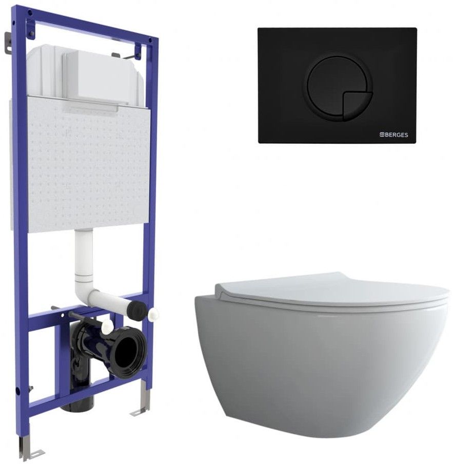 Комплект Berges 4в1 043268: инсталляция NOVUM525 кнопка R5 SoftTouch чёрная унитаз Puma Rimless сиденье Toma Slim SO