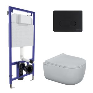 Полный комплект BERGES для монтажа подвесного унитаза. 1. Инсталляция NOVUM525Толщина бачка 80 мм.Межосевое расстояние под крепежные шпильки унитаза 18 и 23 см.Резервуар воды объемом 10 литров с тепло-шумоизоляцией.Уровень шума при давлении 3 бар не превышает 13 дБ.Подвод воды сверху (G1/2 наружная).Объем смыва 3/6 литра с возможностью регулировки. Металлический каркас, окрашенный антикоррозийной эмалью, расчетная нагрузка до 400 кг.Ножки регулировки высоты из оцинкованной стали. Возможность установки в угол. 2. кнопка D5 SoftTouch чернаяABS-пластик 3. унитаз EGO Rimless 49 см,безободковая система смыва, антибактериальное покрытиеэкономия воды, скрытый крепеж 4. сиденье дюропласт Toma Slim SOмикролифт, быстросъем. Все крепежи для установки в комплекте