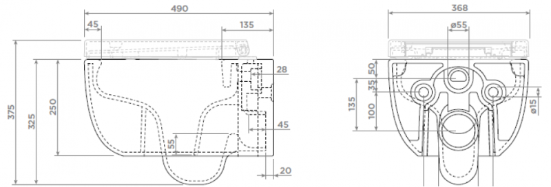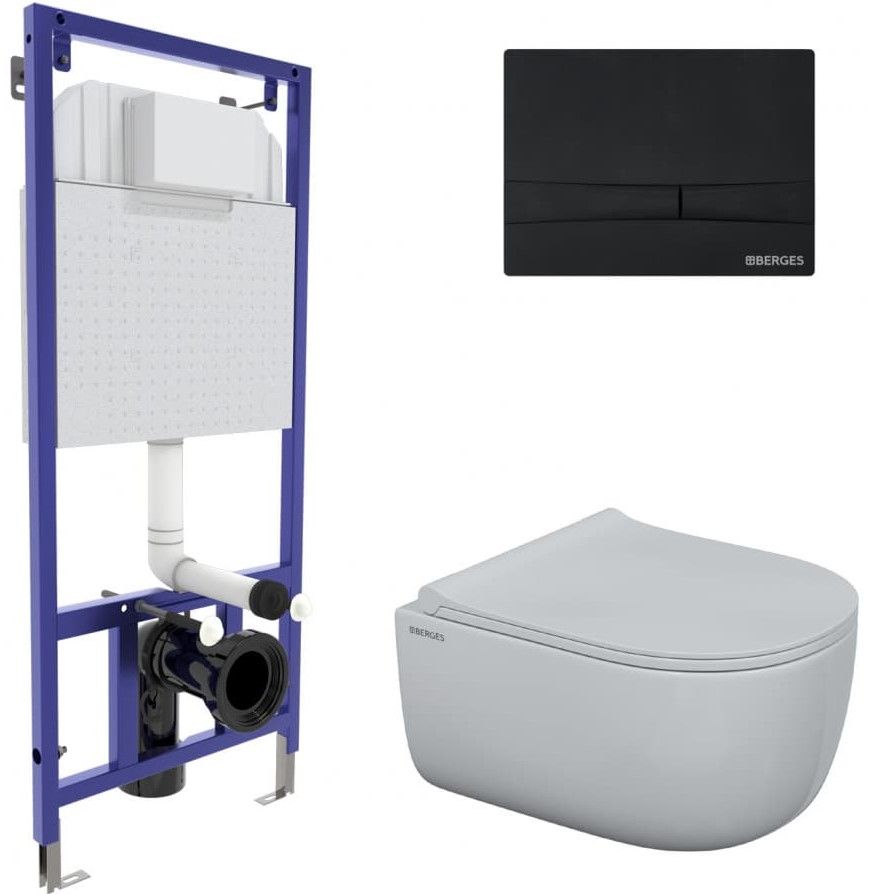 Полный комплект BERGES для монтажа подвесного унитаза. 1. Инсталляция NOVUM525Толщина бачка 80 мм.Межосевое расстояние под крепежные шпильки унитаза 18 и 23 см.Резервуар воды объемом 10 литров с тепло-шумоизоляцией.Уровень шума при давлении 3 бар не превышает 13 дБ.Подвод воды сверху (G1/2 наружная).Объем смыва 3/6 литра с возможностью регулировки. Металлический каркас, окрашенный антикоррозийной эмалью, расчетная нагрузка до 400 кг.Ножки регулировки высоты из оцинкованной стали. Возможность установки в угол. 2. кнопка F5 черная Soft Touch 3. унитаз EGO Rimless,безободковая система смыва, антибактериальное покрытиеэкономия воды, скрытый крепеж 4. сиденье дюропласт Toma Slim SOмикролифт, быстросъем. Все крепежи для установки в комплекте