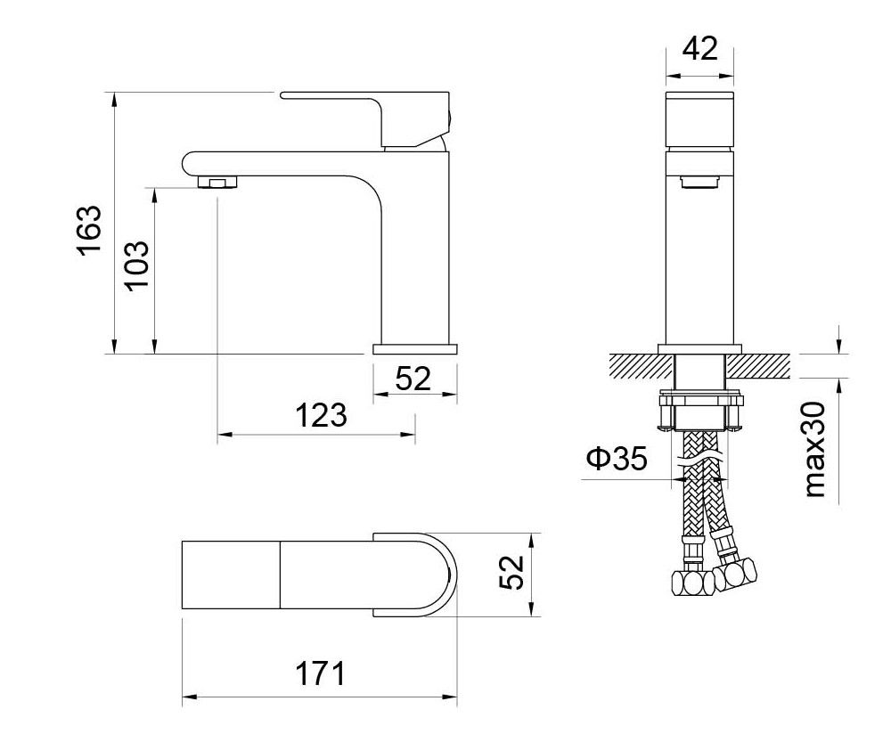 В комплекте: смеситель; гибкая подводка 60см; монтажный комплект