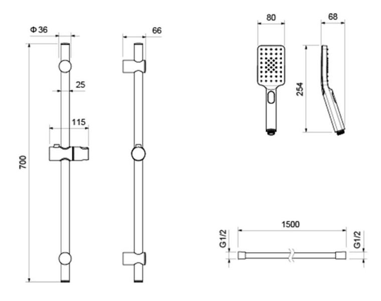 • Душевой гарнитур: душевая стойка, лейка, шланг