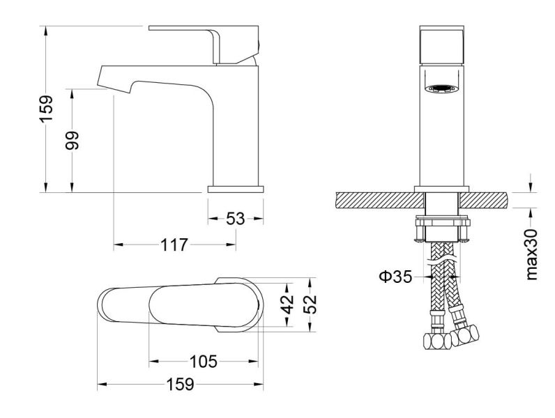 В комплекте: смеситель; гибкая подводка 60см; монтажный комплект
