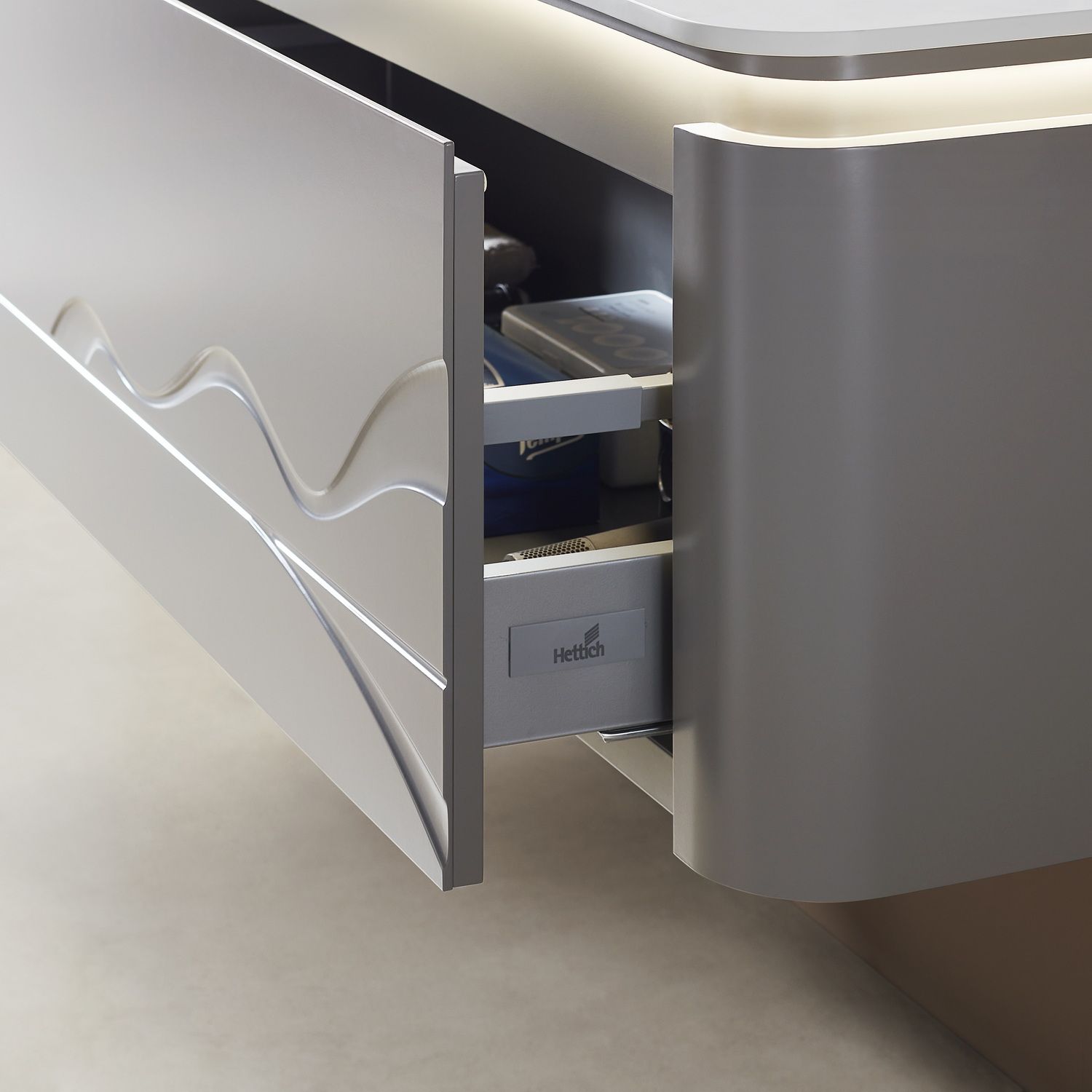 Изделие реализовано в совершенно новом векторе развития. База изготовлена из нержавеющей стали SuS 304 с интегрированной сотовой структурой алюминия для шумоподавления и дополнительной прочности, а также антикоррозионный слой для препятствия воздействию кислоты и щелочи с финальным нанесением покраски. Раковина — столешница изготовлена из искусственного камня на основе природных минералов — Corian. Данный материал не обладает пористостью и тактильно ощущается как soft touch . Концепция чаши со смещением в левую сторону в форме острой капли с плавным переходом на фасад тумбы, донный клапан идет в комплекте. Для хранения предусмотрен один выдвижной ящик с высоким фасадом, оснащенный фурнитурой открывания Hettich с доводчиками. Комплект поставляется вместе с круглым зеркалом с контурной диодной подсветкой и функцией антизапотевания, а также настенной полочкой из нержавеющей стали.