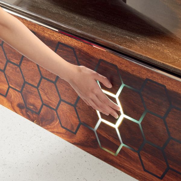 Прогрессивная мебель с инновационным оснащением электроникой и износостойкими материалами. База изготовлена из многослойного листа нержавеющей стали, в который входит: Сотовая алюминиевая структура для лучшего звукопоглощения и амортизационных свойств, а поверх накладывается лист нержавеющей стали SUS 304 , который устойчив к коррозии и воздействию агрессивным элементам. Декоративным слоем является массив дерева, в который интегрированы 47 групп датчиков, они срабатывают при прикосновении к фасаду и изделие буквально оживает, пропуская свет через прозрачные элементы орнамента.