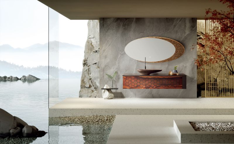 Столешница и накладная раковина изготовлены из натурального мрамора, что дает высокий ресурс и износостойкость элементам изделия. Зеркальное полотно с основанием из нержавеющей стали идет в комплекте с тумбой. Из функционала доступна сенсорная кнопка включения освещения и функции антизапотевания. Корпус изделия шире полотна и задекорирован напылением под золото.