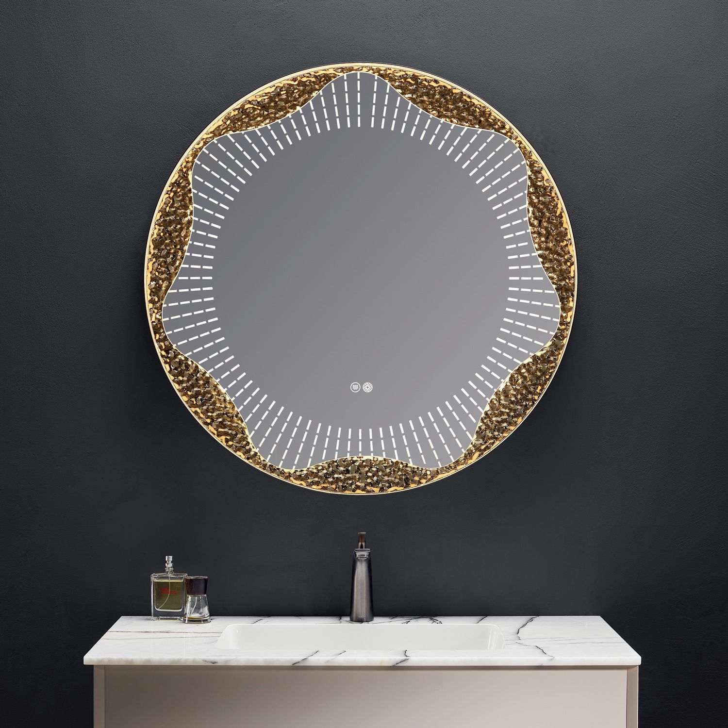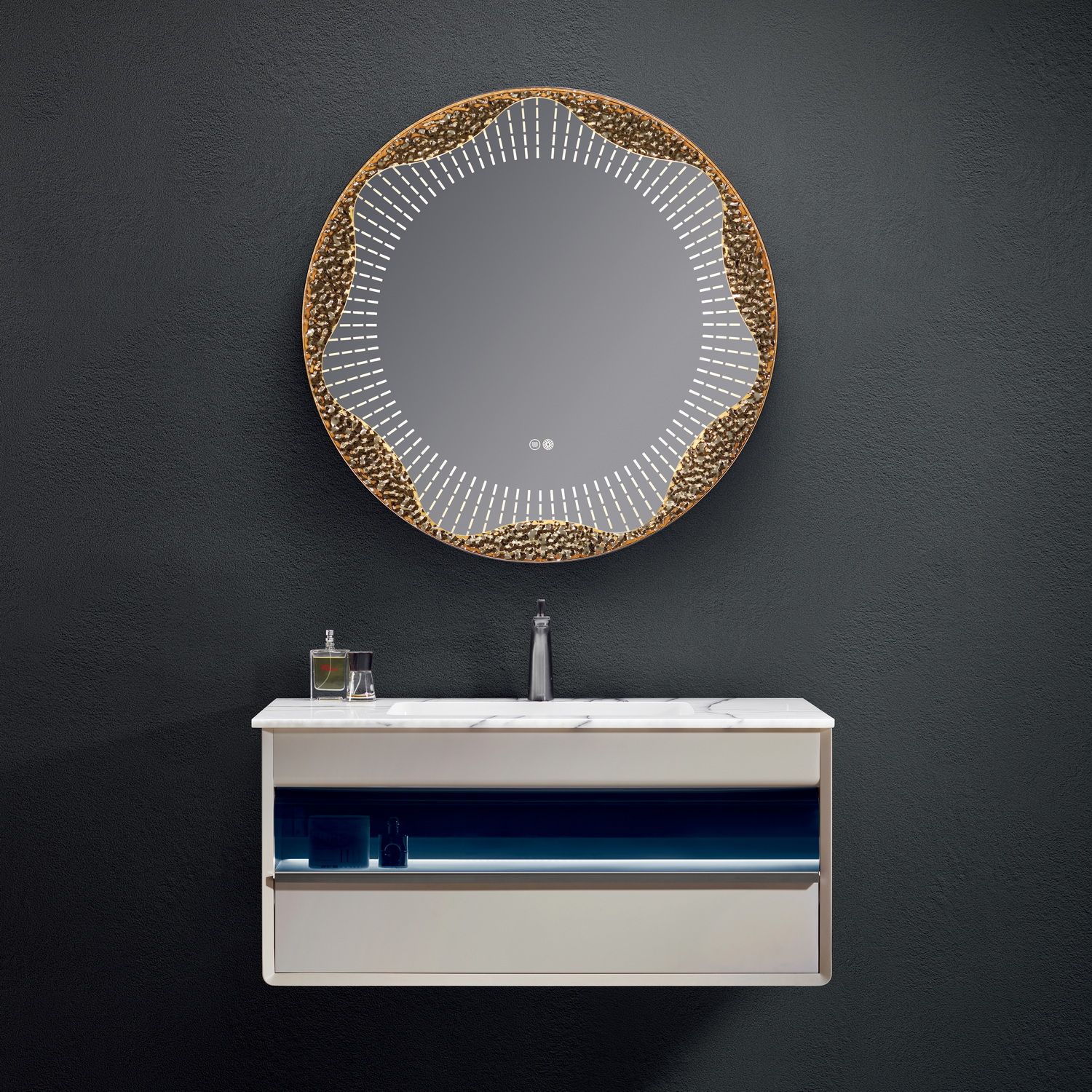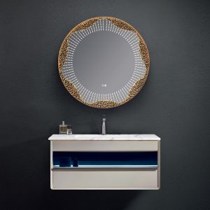 При создании коллекции используются влагостойкие и износостойкие материалы разработанные в соответствии с прогрессивными технологиями в мебели строения. База выполнена из многослойного листа, состоящий из алюминиевой сетки для амортизации и шумоподавления, листа нержавеющей стали SuS 304 с дополнительным антикоррозионным, покрытием и финишной окраской специальной эмалью. На изделие установлена раковина — столешница, выполненная из мрамора с интегрированной керамической раковиной. Слив комплектуются донными клапанами в цвете хром. Место для хранения представлено внутренней нишей и выдвижным ящиком на направляющих бренда Unihopper с доводчиками. Также важным стилистическим элементом является диодная подсветка, срабатывающая с 3-х метров при приближении человека. Зеркало круглой формы с декоративными элементами золотого цвета, также на полотно установлена функция антизапотевания. Основание зеркала изготовлено из профиля нержавеющей стали.