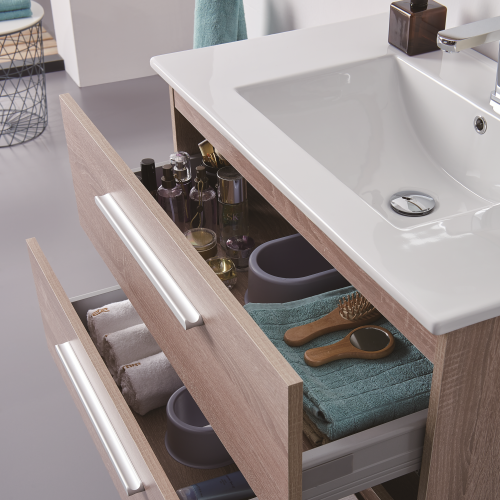 1. Многослойное дерево, 2. Два выдвижных ящика с доводчиками 3. Цвет: темный дуб . 4. Зеркало с полкой. 5.Раковина в комплекте.