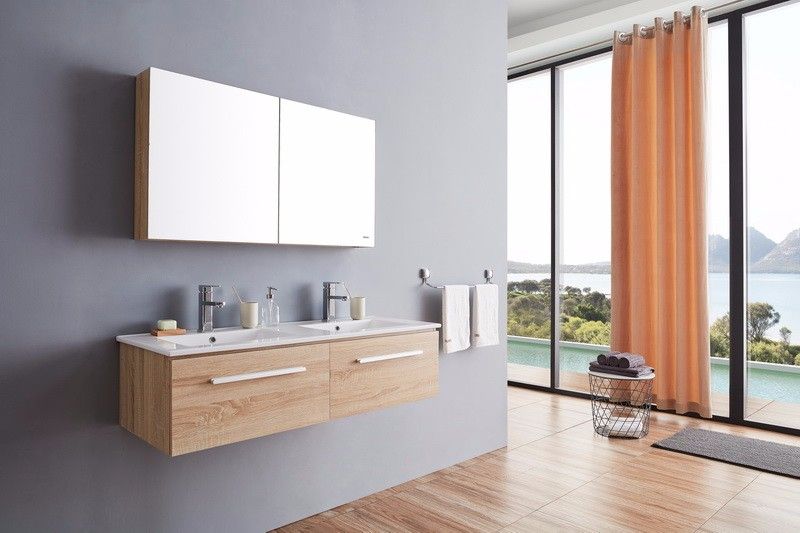 1. Многослойное дерево, 2. Два выдвижных ящика с доводчиками 3. Цвет: темный дуб . 4.Зеркальный шкаф 5.Раковина в комплекте.