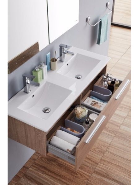 1. Многослойное дерево, 2. Два выдвижных ящика с доводчиками 3. Цвет: светлый дуб. 4. Зеркальный шкаф 5.Раковина в комплекте.