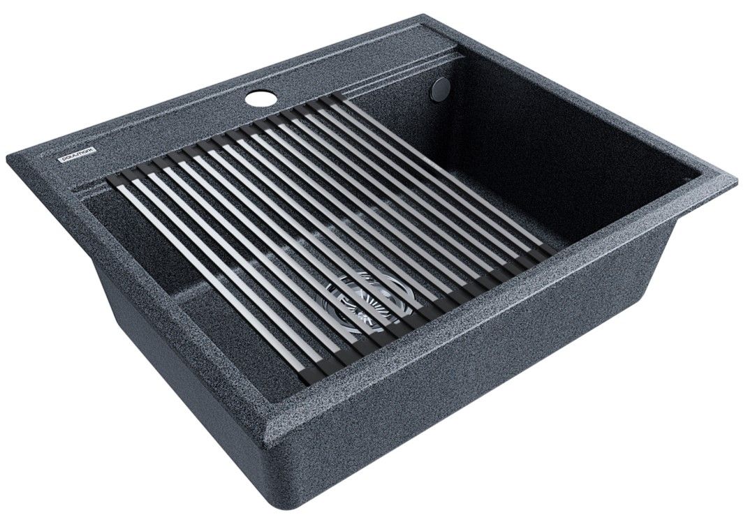 Комплект мойка STEPIA 60 + ролл-мат STEP, PM115951-DG+R375-BSСтильный и многофункциональный комплект мойки из композитного материала на основе гранита и ролл-мата из высококачественной нержавеющей стали для создания комфортной рабочей зоны на вашей кухне.Мойка STEPIA 60 изготовлена из IT-GRANIT – композитного материала на основе гранита, благодаря чему мойка не потеряет свой первоначальный цвет за многие годы использования даже при длительном воздействии солнечных лучей. Материал мойки устойчив к сколам, царапинам и деформациям. На горизонтальных гранях чаши мойки предусмотрены специальные выступы-ступеньки, которые позволяют использовать такие аксессуары, как ролл-маты, доски, коландеры и пр. для создания дополнительной рабочей поверхности на кухне. Дно чаши мойки имеет 4 грани, направленных к сливу под индивидуальным градусом для максимально быстрого ухода воды.