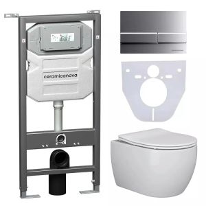 Сет 4 в 1: CN3001_1002M_1000Подвесной унитаз PLAY Rimless арт. CN3001Шумоизоляционная панель для инсталляции арт. CN1000Система инсталляции для унитазов CERAMICANOVA Envision с кнопкой смыва Flat цвет хром матовый, креплениями, арт. CN1002MПодвесной унитаз Play Rimless CN3001, глубокий смыв, с крепежом для полностью скрытого монтажа, ультра тонким с сидением и крышкой с функцией плавного закрытия, дюропласт.Шумоизоляционная панель для инсталляции, арт. CN1000