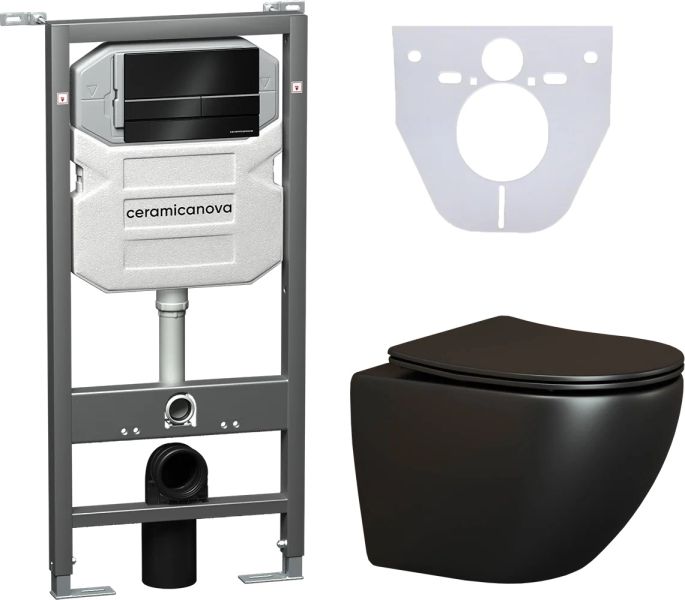 Сет 4 в 1: CN4002MB_1002B_1000Подвесной унитаз Metropol Rimless арт. CN4002MBШумоизоляционная панель для инсталляции арт. CN1000Система инсталляции для унитазов CERAMICANOVA Envision с кнопкой смыва Flat цвет черный матовый, креплениями, арт. CN1002B Подвесной безободковый унитаз Ceramica Nova Metropol Rimless черный матовый, сиденье микролифт, CN4002MB