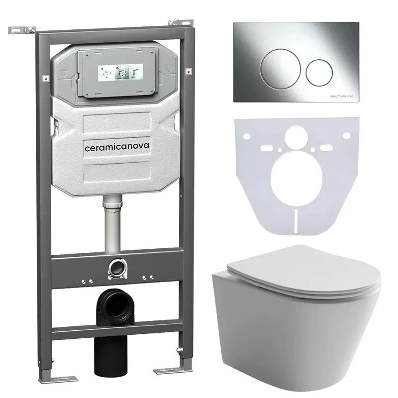 Сет 4 в 1: CN6000_1001CH_1000Подвесной унитаз Balearica Rimless арт. CN6000Шумоизоляционная панель для инсталляции арт. CN1000Система инсталляции для унитазов CERAMICANOVA Envision с кнопкой смыва Round цвет хром и креплениями, арт. CN1001CH Подвесной унитаз Balearica Rimless CN6000, глубокий смыв, с крепежом для полностью скрытого монтажа, ультра тонким с сидением и крышкой с функцией плавного закрытия, дюропласт