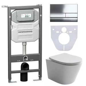 Сет 4 в 1: CN6000_1002CH_1000Подвесной унитаз Balearica Rimless арт. CN6000Шумоизоляционная панель для инсталляции арт. CN1000Система инсталляции для унитазов CERAMICANOVA Envision с кнопкой смыва Flat цвет хром, креплениями, арт. CN1002CH Подвесной унитаз Balearica Rimless CN6000, глубокий смыв, с крепежом для полностью скрытого монтажа, ультра тонким с сидением и крышкой с функцией плавного закрытия, дюропласт