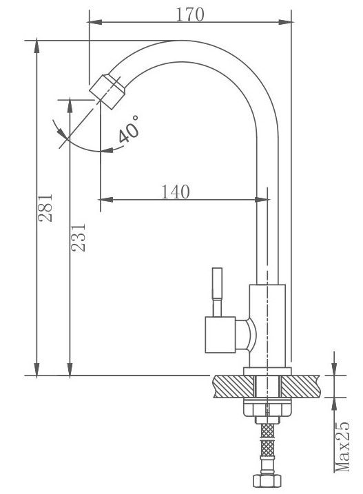 Кран на одну воду бренда Haiba.Изготовлен из нержавеющей стали.Картридж 35 мм.Укомплектован аэратором.Гибкая подводка 40 см.С поворотным изливом.