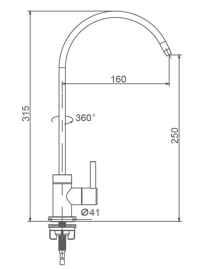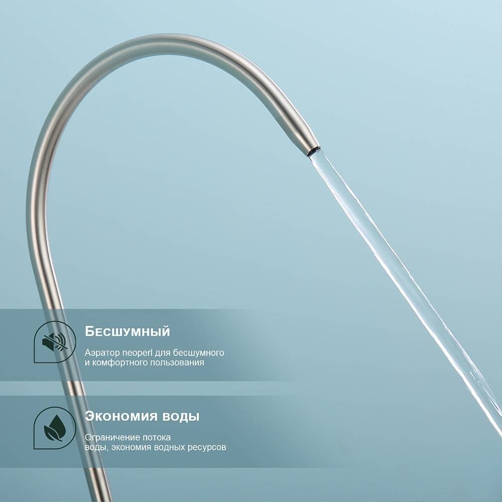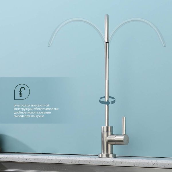 Кран на одну воду с подключением фильтра питьевой воды Splenka S249.60.05. Материал: нержавеющая сталь. Управление: однорычажное. Механизм: керамическая кран-букса. Излив: поворотный. Стандарт подводки: G 1/2. Тип подводки: гибкая. Аэратор. Монтаж: на мойку.