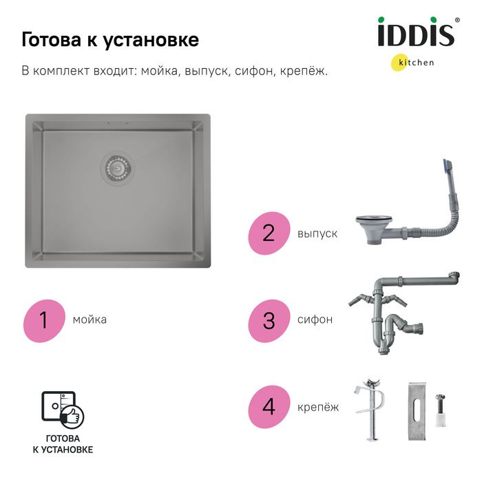 В комплекте все необходимое: 2 набора крепежей, выпуск, плоский сифон (занимает меньше места, освобождая полезное пространство под мойкой).