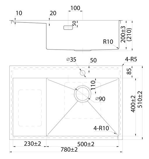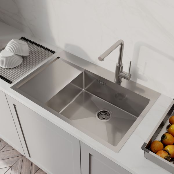 Мойка Haze отличается современным дизайном и ручным методом производства, что создает идеальную геометрию – малый радиус скругления углов увеличивает рабочее пространство без «слепых» зон. Глубина 20 см. Удобно разместить много посуды и мыть крупные предметы. Подходит для шкафа от 55 см.
