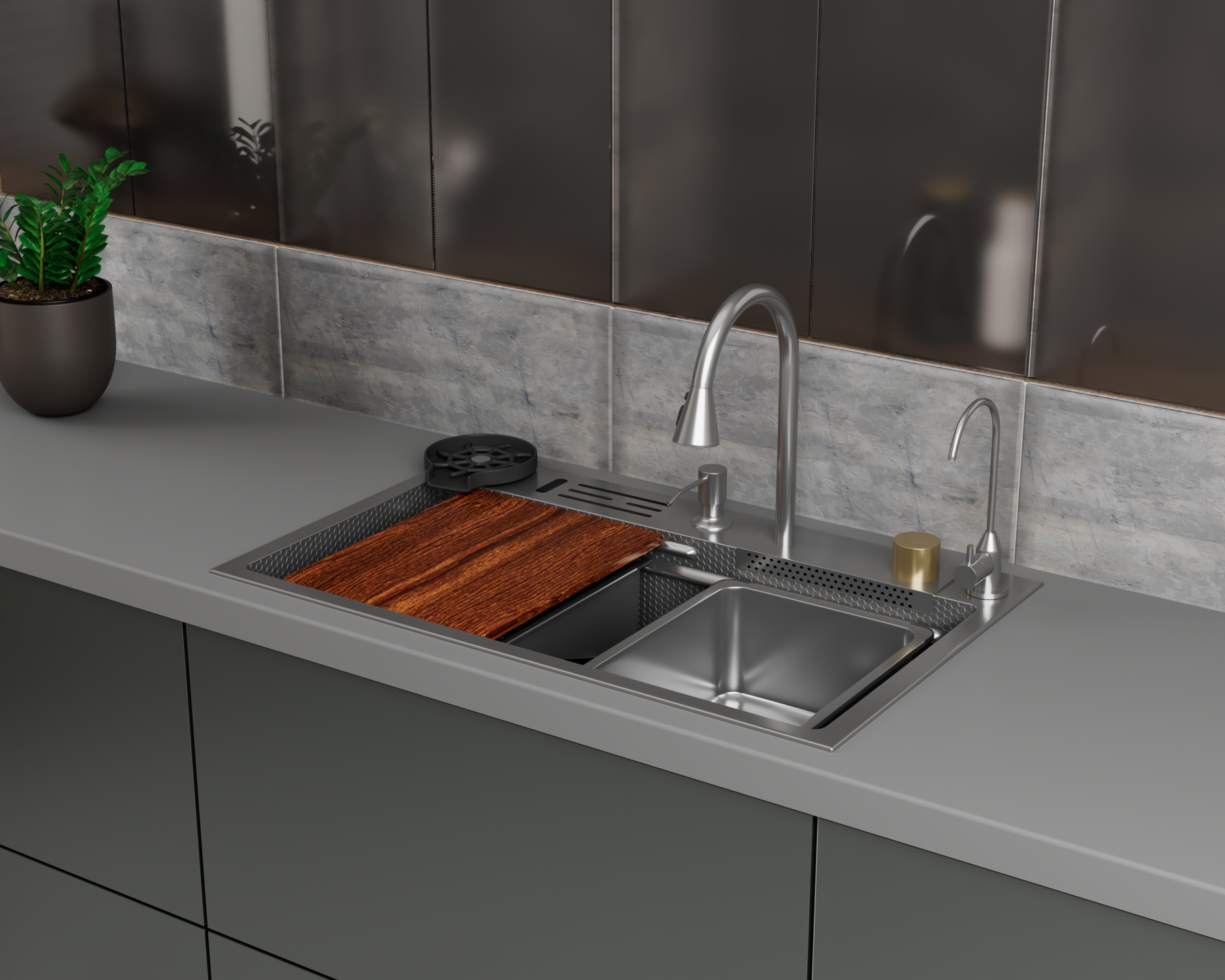 Кухонная мойка многофункц. DQ нерж.сталь сатин в комплекте со смесителем и аксессуарами (DKS754604)