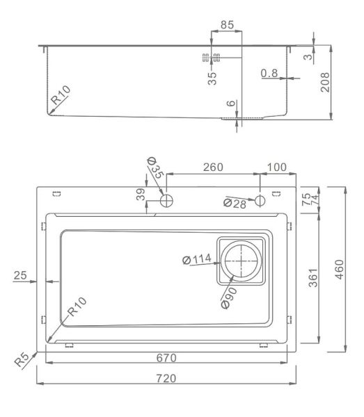 Толщина стали: верх - 3 мм / чаша - 0.8 мм, дополнительное отверстие для установки дозатора