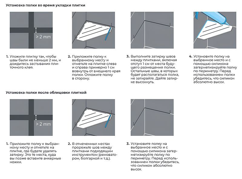 Металлическая полка RGW MT-01W 49279901-01 угловая БелаяПолка для душевой зоны RGW MT - современное решение для душевого пространства. Изготовлены из нержавеющей стали AISI 304, прочные, не ржавеют. Форма и размер полки, позволяет достичь максимальной стабильности конструкции и достаточной вместительности душевых принадлежностей, а легкая и быстрая установка в межплиточные швы без сверления плитки выгодно выделяет данное решение. Легкий монтаж без сверления плитки: Полки для душевой зоны, разработанные специально для монтажа после завершения ремонта, т. е. укладки плитки. Легко устанавливаются в любые угловые зоны в помещении, для этого прорезается шов между плитками, далее полочка вклеивается между плиткой на любой бытовой герметик. Полочки для душевой зоны RGW MT идеально подойдут для установки в душевое пространство, или в любую комнату, а так же найдут применение, на кухнях или в других помещениях.