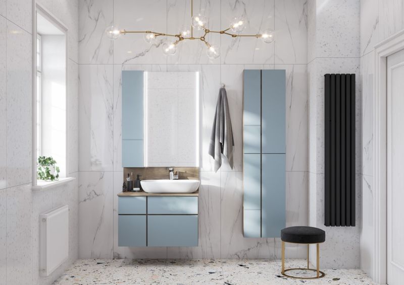 - Открывается модуль за фасад. Внутреннее пространство шкафчика поделено на ассиметричные секции, что позволяет разместить различные косметические средства