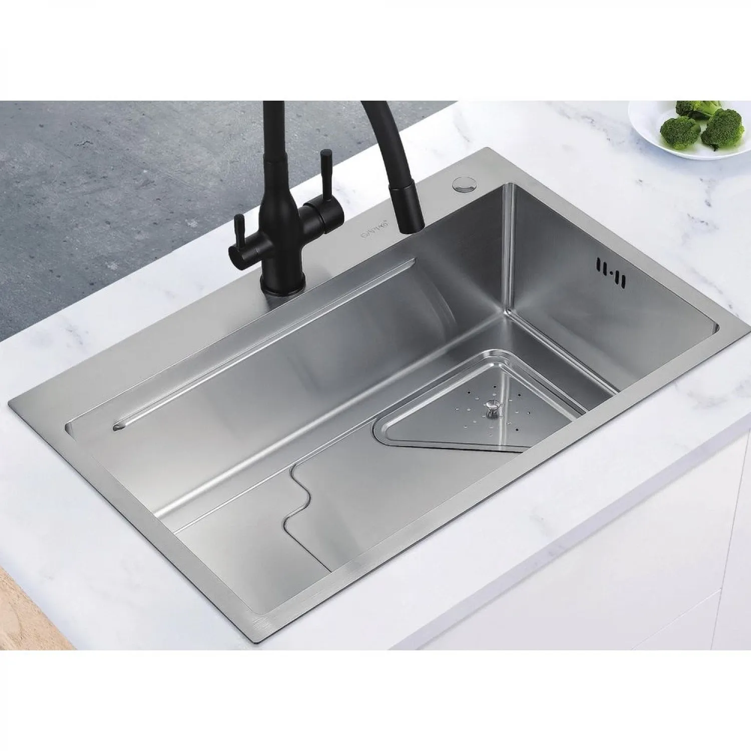 Мойка из нержавеющей стали – это удобное и функциональное решение для вашей кухни. Оборудована коландером, который позволяет легко процеживать продукты и сливать воду после мытья овощей и фруктов. Изготовленная из прочной нержавеющей стали, мойка обеспечивает долговечность и стойкость к коррозии. Благодаря глянцевой поверхности, она легко моется и сохраняет свой блеск на долгое время. Также устойчива к царапинам и воздействию высоких температур. Мойка с коландером предлагает удобство и функциональность в использовании, что делает ее отличным выбором для современной кухни. Приобретите нашу мойку для кухни из нержавеющей стали и наслаждайтесь удобством и функциональностью каждый день!