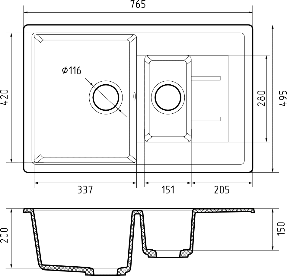 Размеры чаш: 337х420х200 мм, 151*280*150 мм