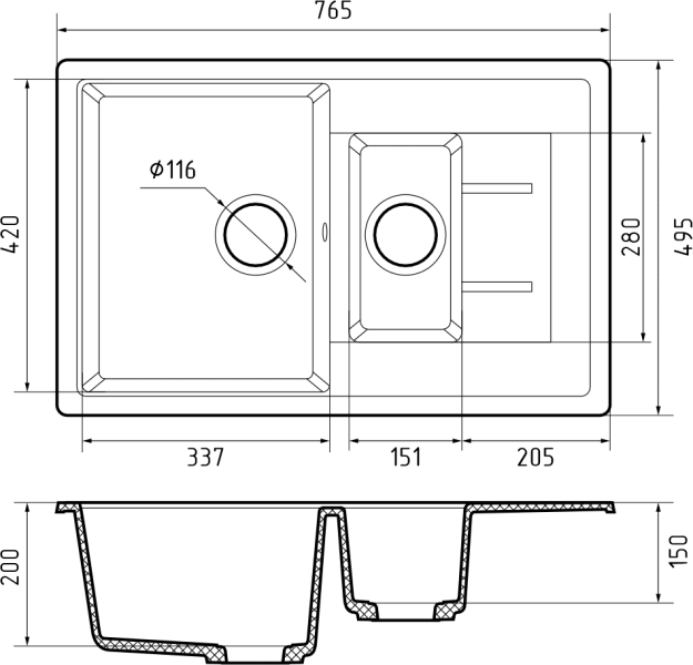 Размеры чаш: 337х420х200 мм, 151*280*150 мм