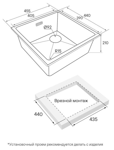 Мойка создана как для современного способа монтажа под столешницу, так и для классического врезного монтажа.Смещенный слив