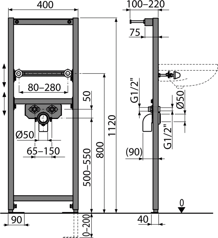 - Интервал крепления умывальника 80-280 мм