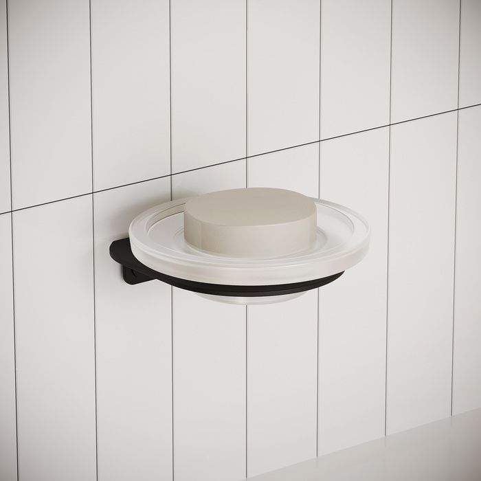 Каждый предмет из новой коллекции NOA минималистичен на вид и максимально функционален, благодаря чему способен выгодно подчеркнуть любой современный или классический дизайн. Коллекция представлена всеми необходимыми аксессуарами для создания единого стиля туалетной или ванной комнаты – с ними ежедневный уход станет еще более комфортным. Мыльница из матового стекла в стильном обрамлении трендового черного цвета будет элегантно смотреться в темных интерьерах и мягко балансировать яркие, цветные. Отличительная особенность аксессуара – его форма, которая подойдет как для обычного, так и для фигурного мыла, позволив сэкономить место на раковине за счет настенного крепления.