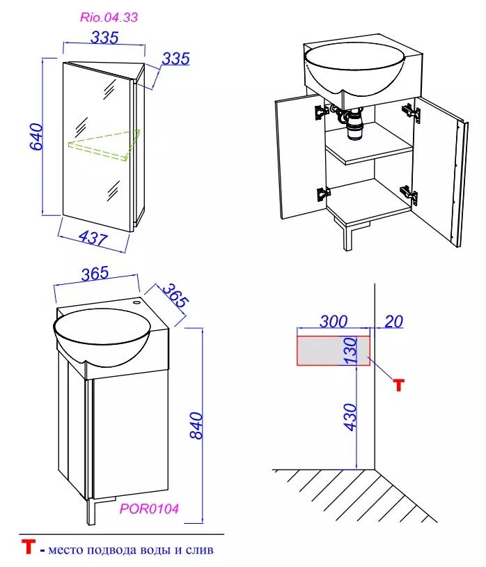 Тумба под раковину Aqwella Porto 45 см напольная, белый, черный, POR0104WB